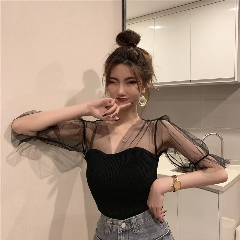 Images of 2019 Jul New women's V-neck net yarn stitching knitted shirt tops female girls slim sexy Puff short Sleeve Ruffles t-shirt G680 :