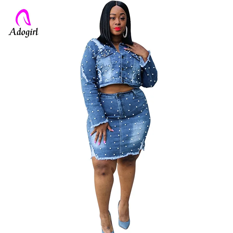 Images of Plus Size Women Pearls Jeans Two Piece Set Dress Washed Holes Long Sleeve Short Jacket Bodycon Mini Skirt Matching Suit XL-5XL :