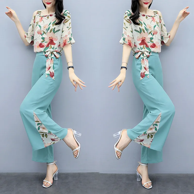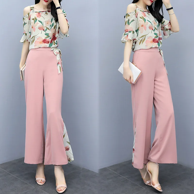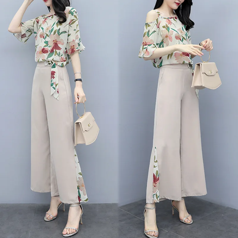 Buy Fashion off shoulder Chiffon Top + cropped pants wide leg pants suit two piece set