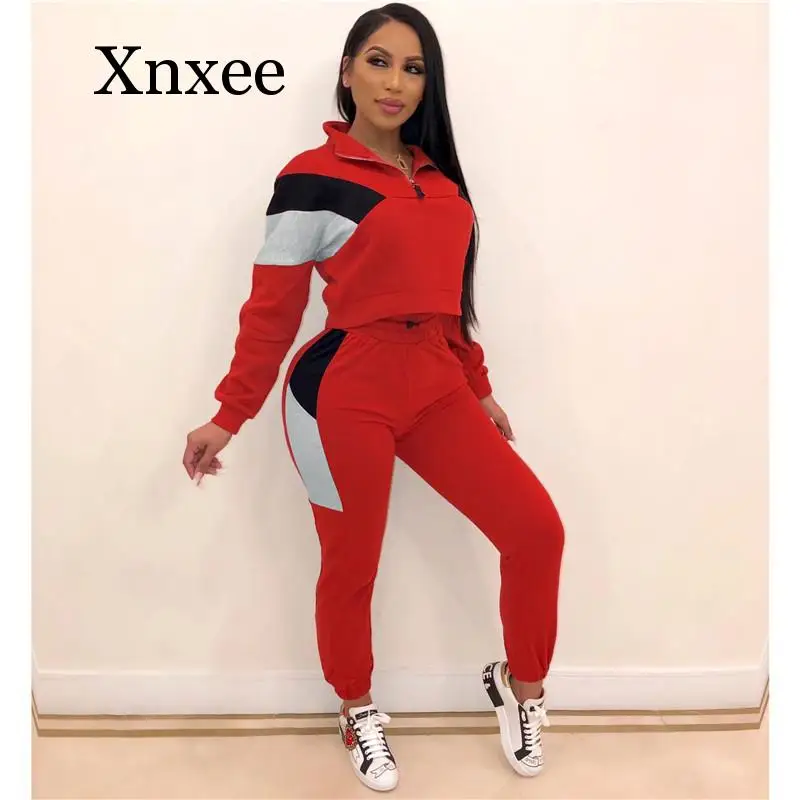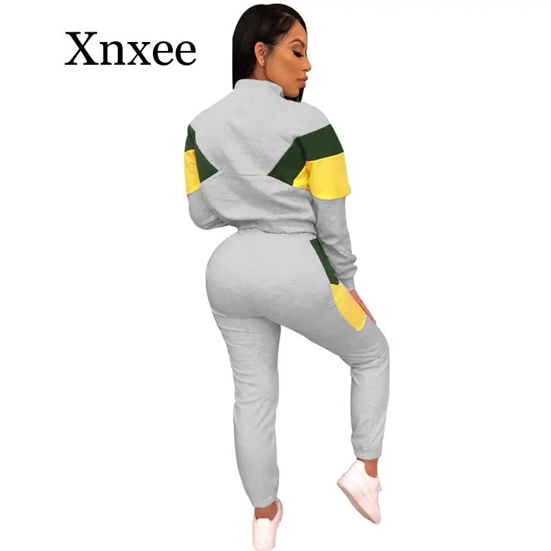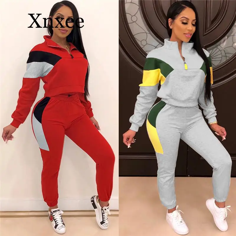 Images of run Winter Women Sport 2 Piece Tracksuit Color Patchwork Full Sleeve Turn-down Collar Sweatshirt Pants Casual Sweatsuit Outfits :