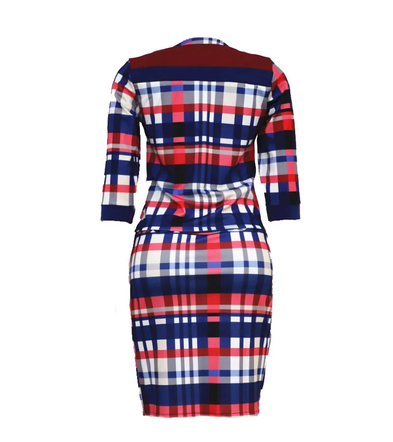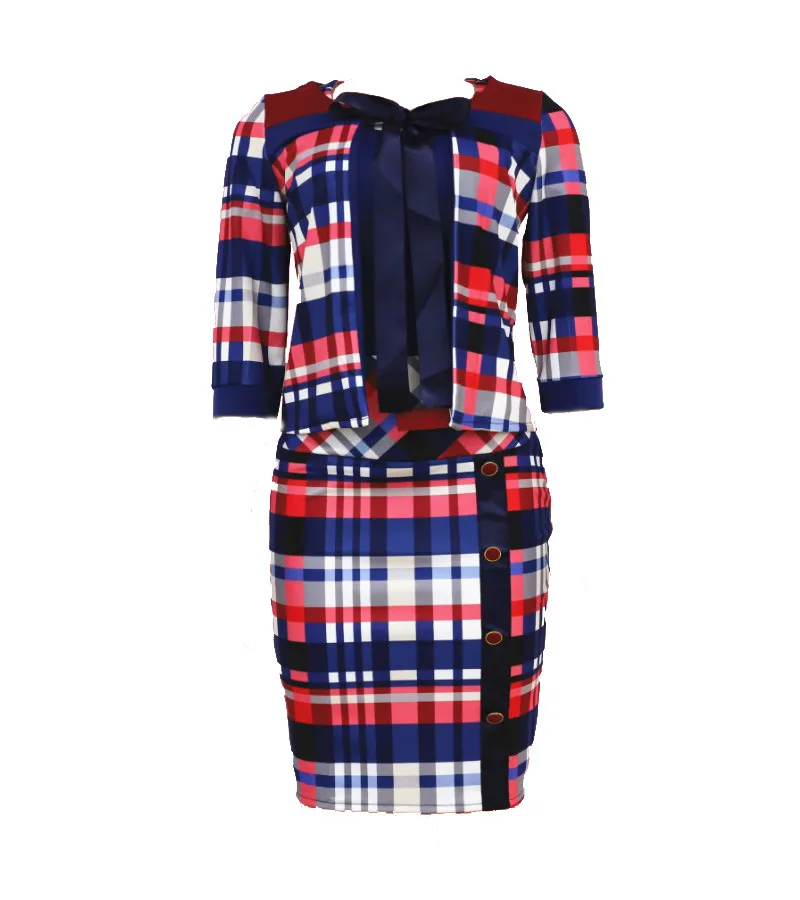 Images of Women Plus Size 4XL Office Work 2 Piece Set for Female Lady Plaid Print Short Sleeve Dress Elegant Casual Two Piece Outfits :