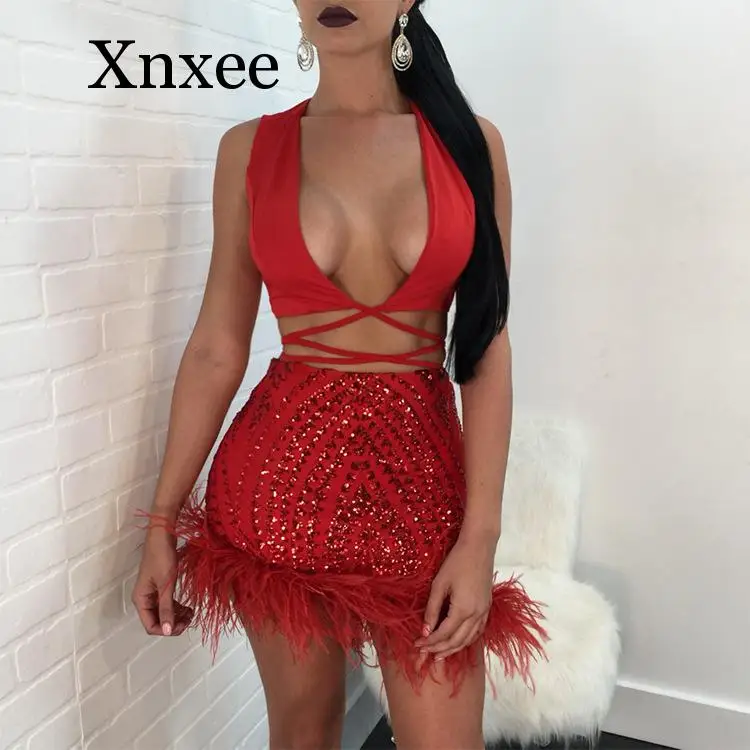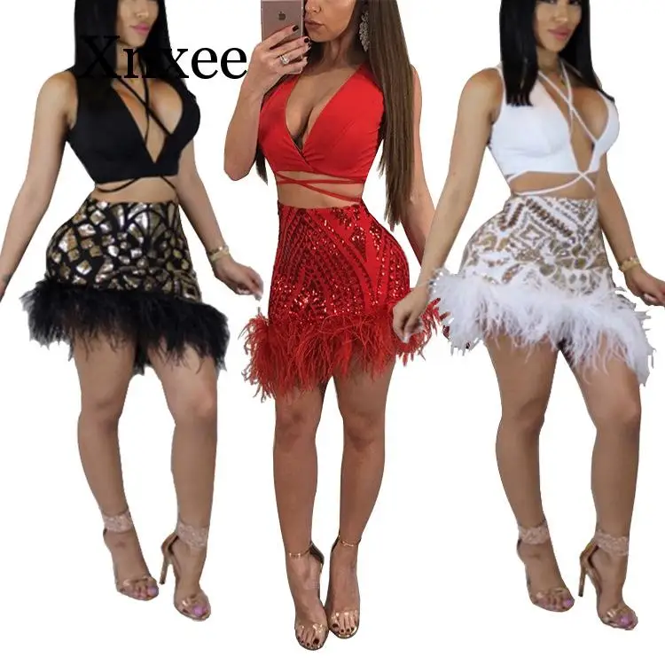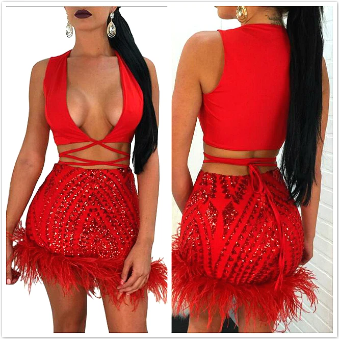 Images of Women Sexy Party Sequin Two Piece Sets V-Neck Sleeveless Bandage birthday Top and Feather Mini Skirts Bling Noble African :