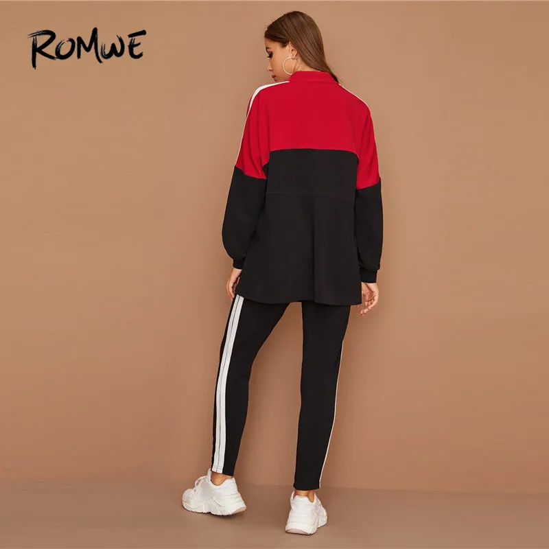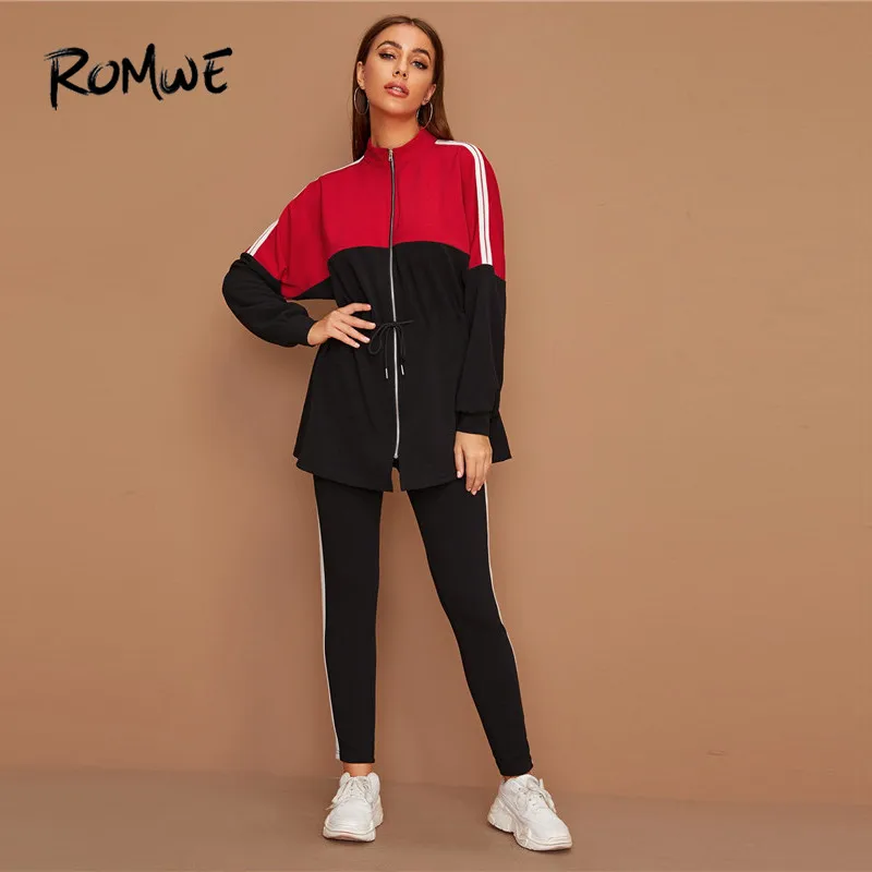 Images of ROMWE Drawstring Waist Colorblock Coat and Joggers 2 Piece Set Tracksuit Women Fall Spring Activewear Outfits Casual Sweatsuits :