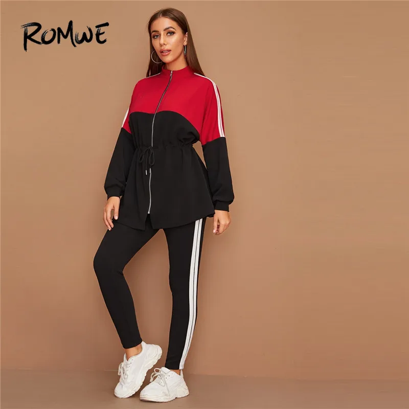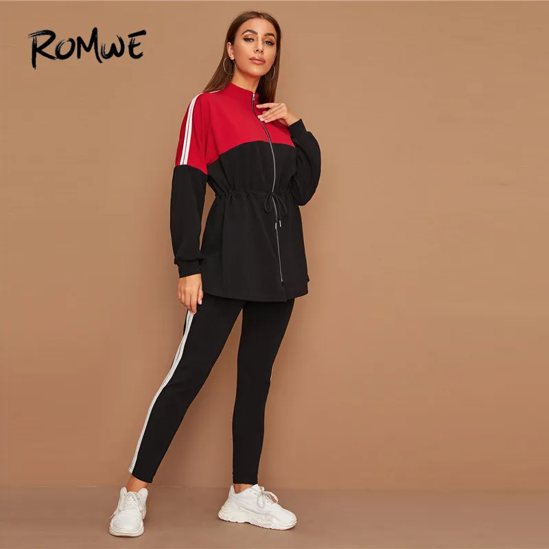Best Offer ROMWE Drawstring Waist Colorblock Coat and Joggers 2 Piece Set Tracksuit Women Fall Spring Activewear Outfits Casual Sweatsuits