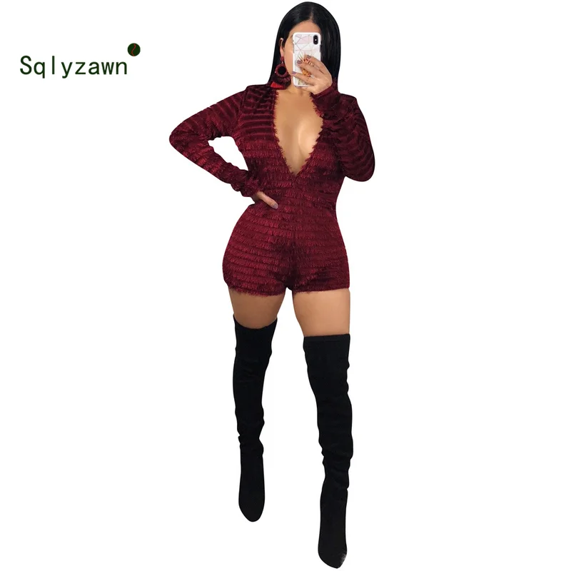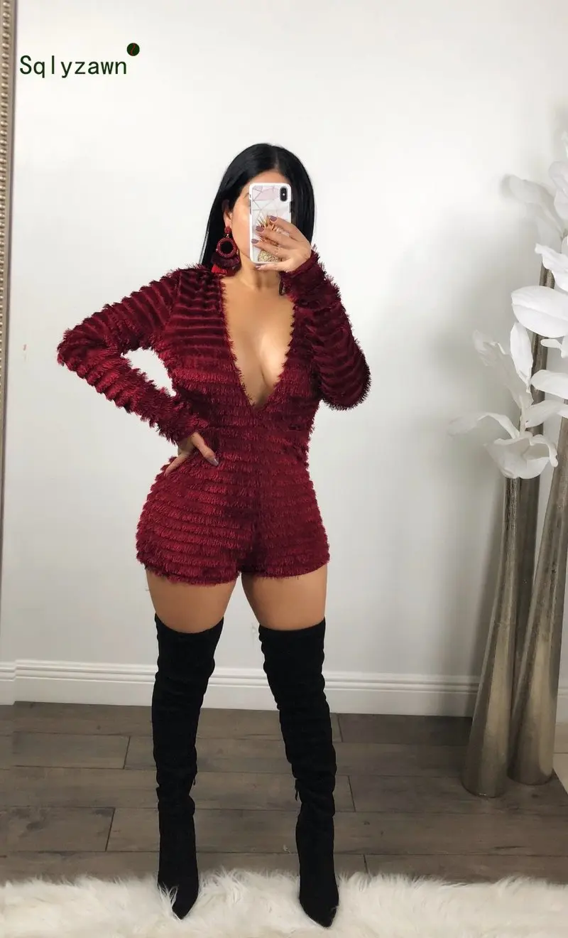 Best Offer Winter Sexy Faux Fur Jumpsuit Coat Romper Bodycon Deep V Backless Playsuit Women's Slim Fit Long Sleeve V-Neck Women Overalls