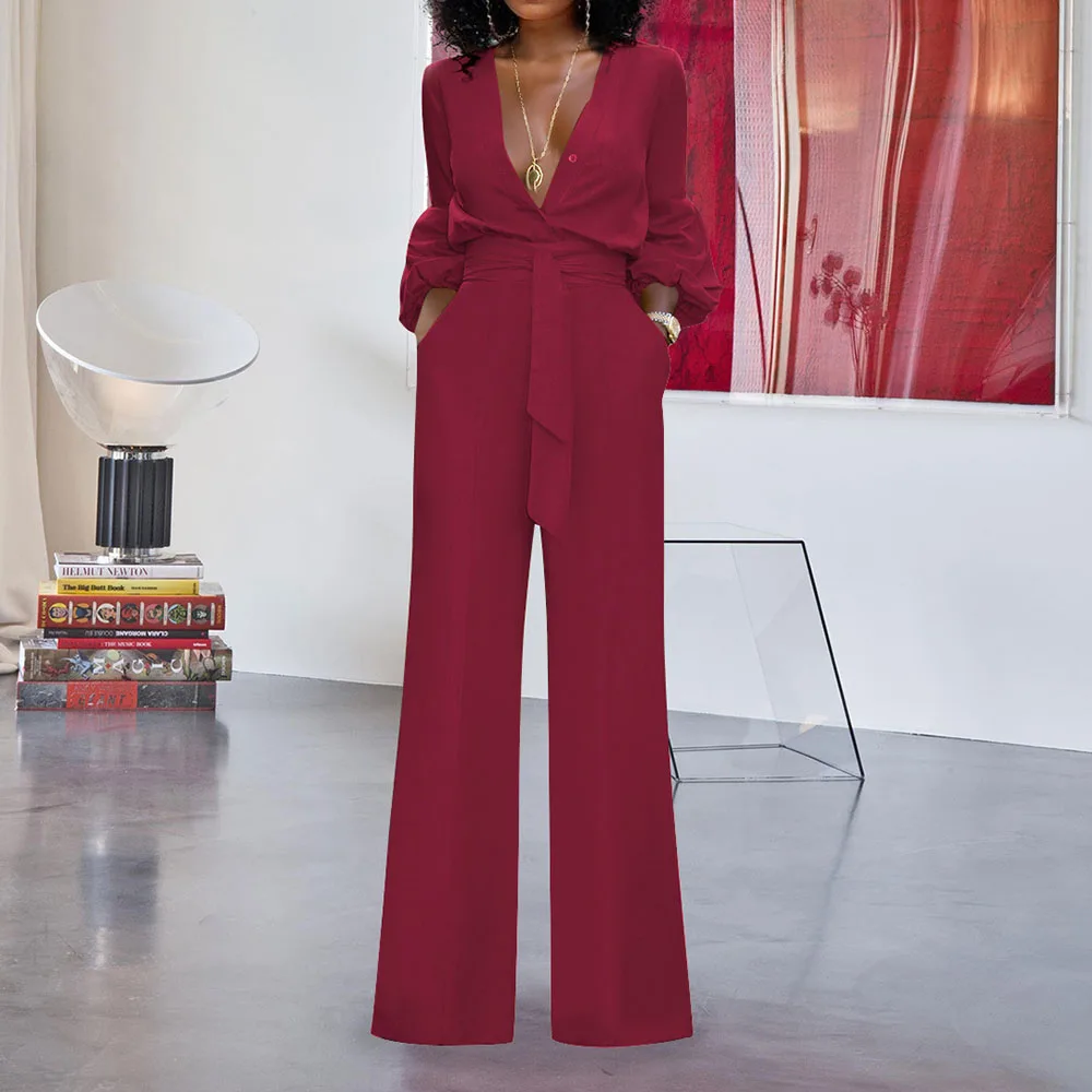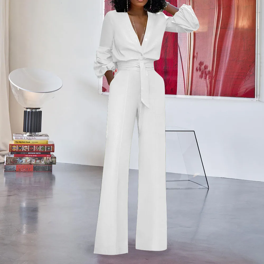 Best Offer Women Sexy Jumpsuit Deep V-Neck Jumpsuits Wide Leg Pants Elegant Romper Puff Sleeve Casual Party Overalls Sash Female Pure White