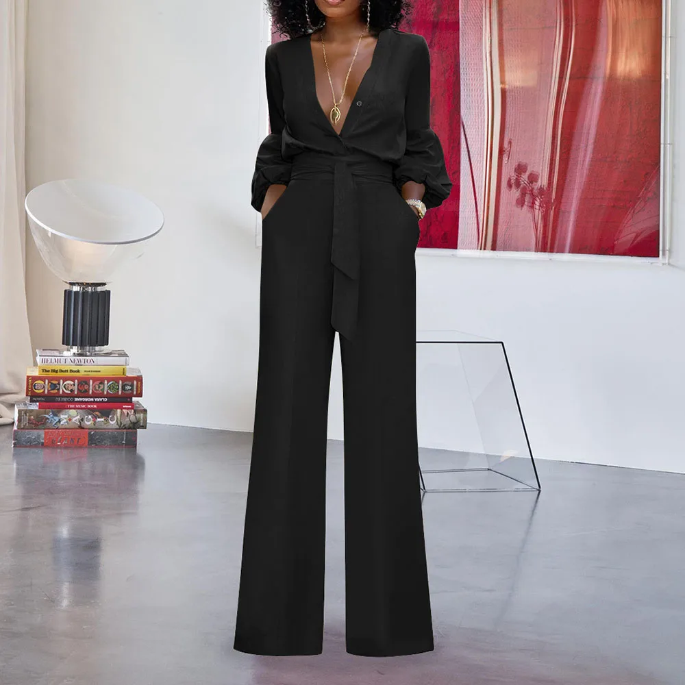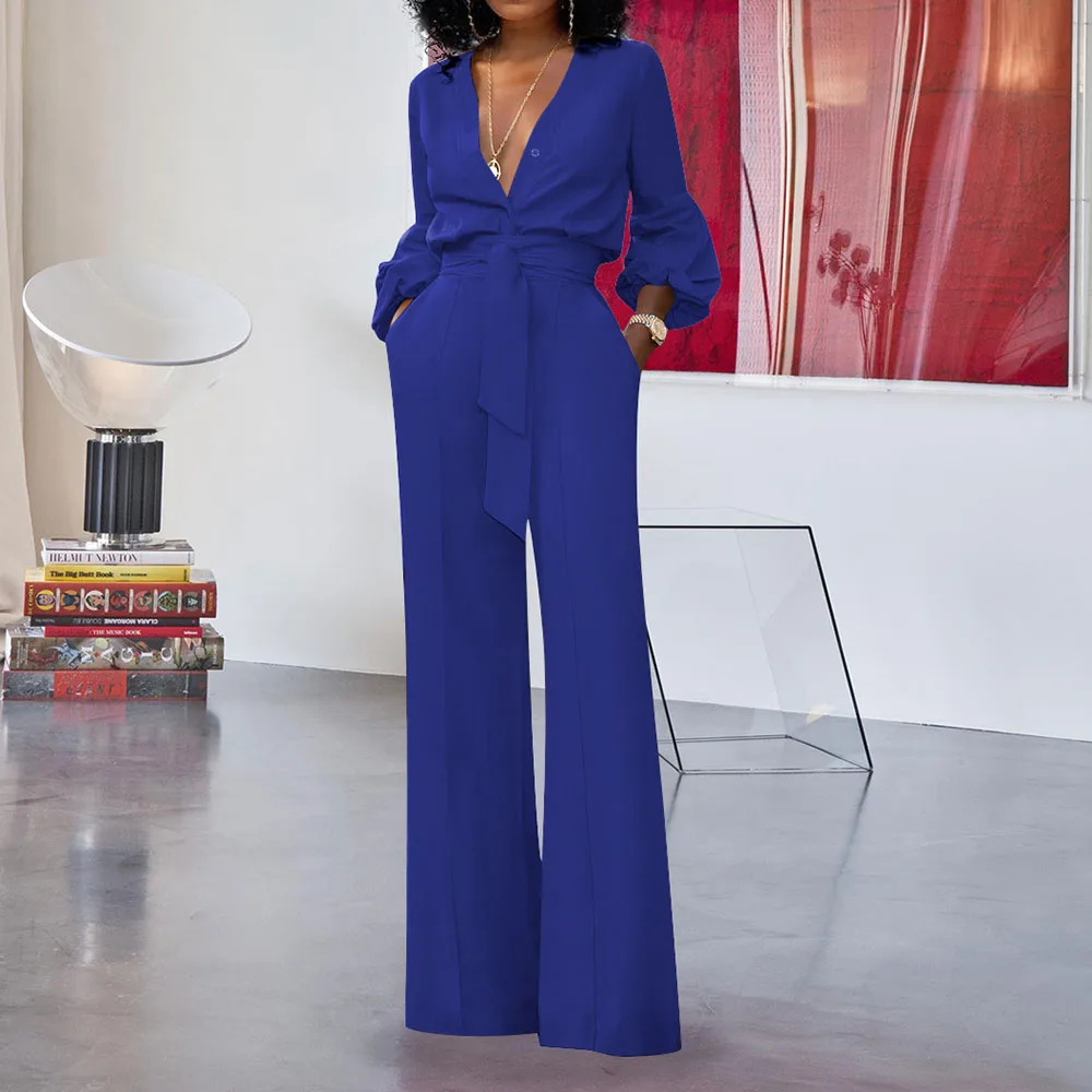 Get this Women Sexy Jumpsuit Deep V-Neck Jumpsuits Wide Leg Pants Elegant Romper Puff Sleeve Casual Party Overalls Sash Female Pure White with limited time discount by pressing the button below