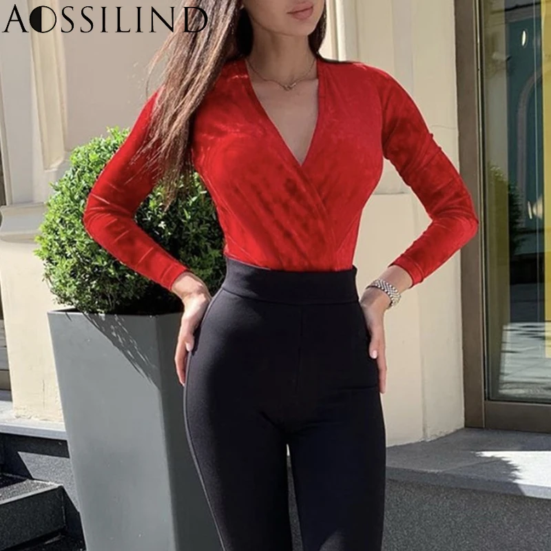 Best Offer AOSSILIND Velvet long sleeve v-neck bodycon sexy bodysuit 2019 autumn winter women casual slim body suits
