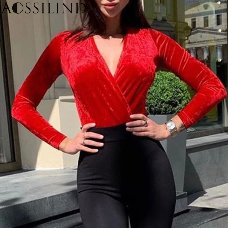 Images of AOSSILIND Velvet long sleeve v-neck bodycon sexy bodysuit 2019 autumn winter women casual slim body suits :
