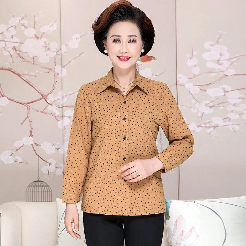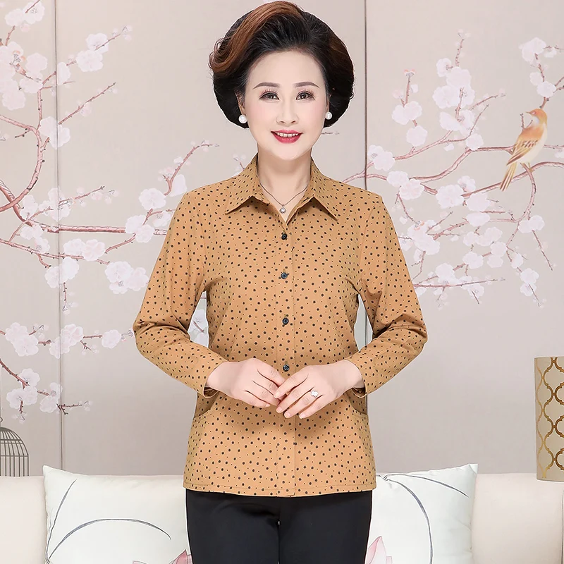 New Middle Aged Women Casual Shirt Navy Blue Khaki Printing Pattern Turn Down Collar Long Sleeve Button Front Top Plus Size Clothes